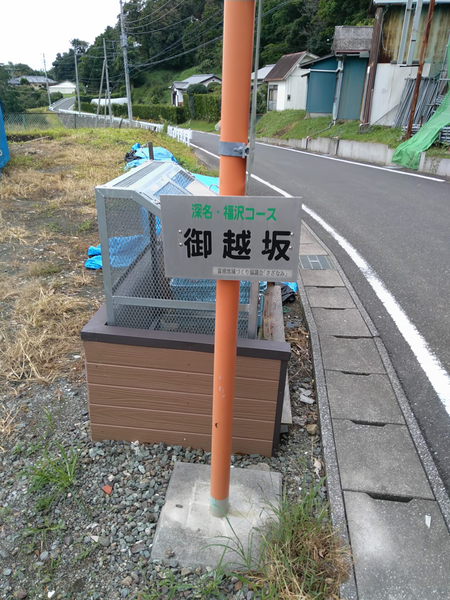 丹生を過ぎた頼朝は金尾谷の磯草(福沢)から大きな坂を超え館山方面に行きました。その坂は今、「御越坂(おっこしざか)」と呼ばれています。頼朝という偉い人がお越しになった坂だからと、土地の人たちが名付けたのです。