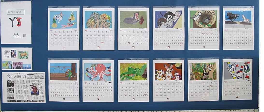 先月号(第148号)で紹介した合戸地区にお住いのヨシヒロさんが運営する「アトリエ 良の里」2023年オリジナルカレンダーを富山岩井コミュニティセンターロビーに展示しました。カレンダーのイラストはパソコンを使って繊細なタッチで描かれており、観た方から「すごい!」と声が出る創造溢れる作品です。富山岩井コミュニティセンターにお立ち寄りの際は是非ご覧になって頂ければと思います。