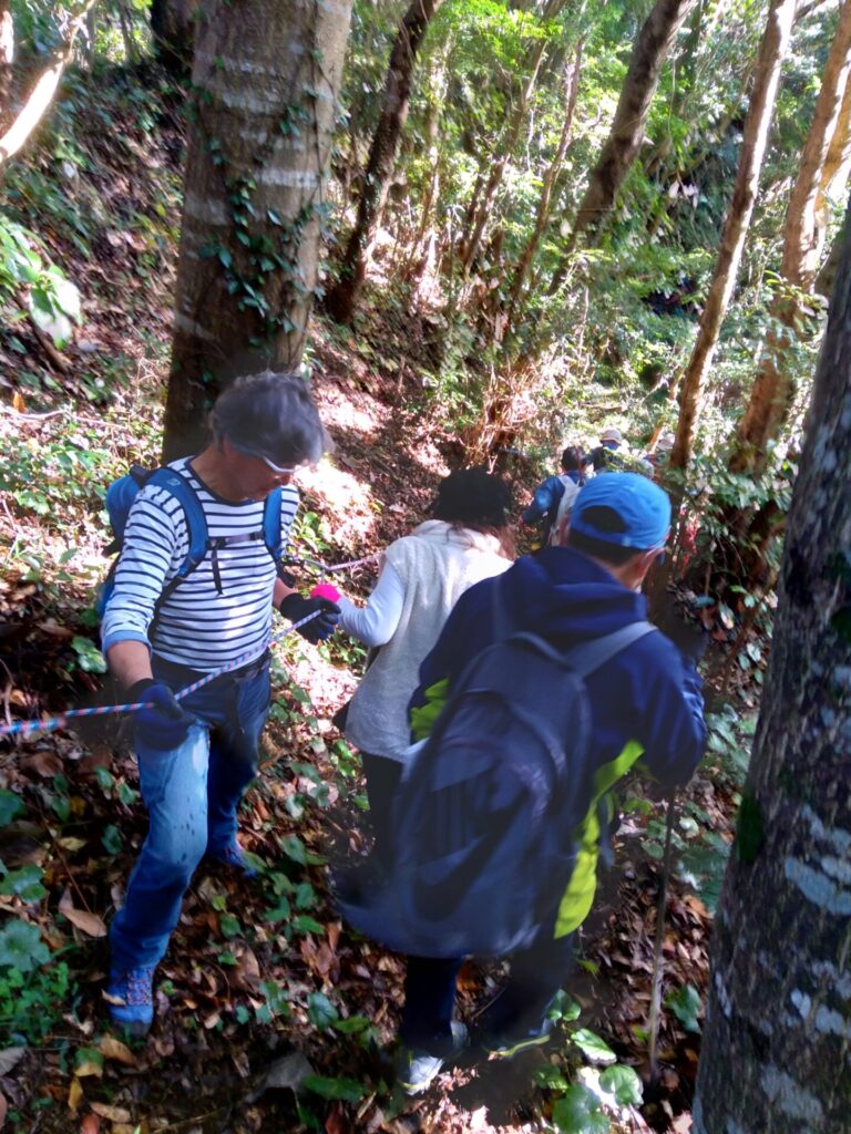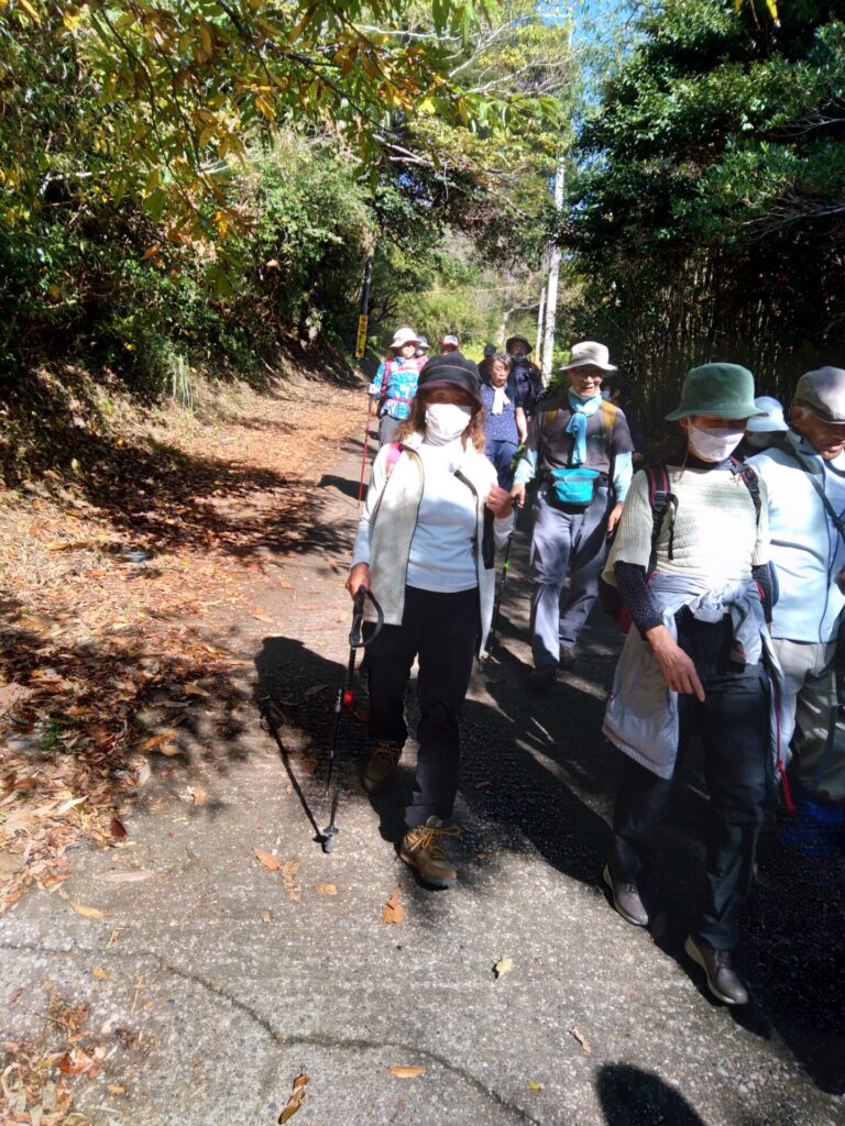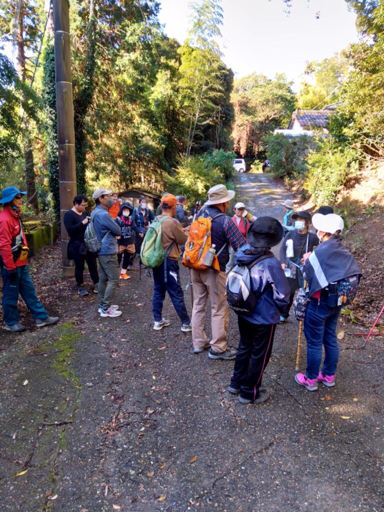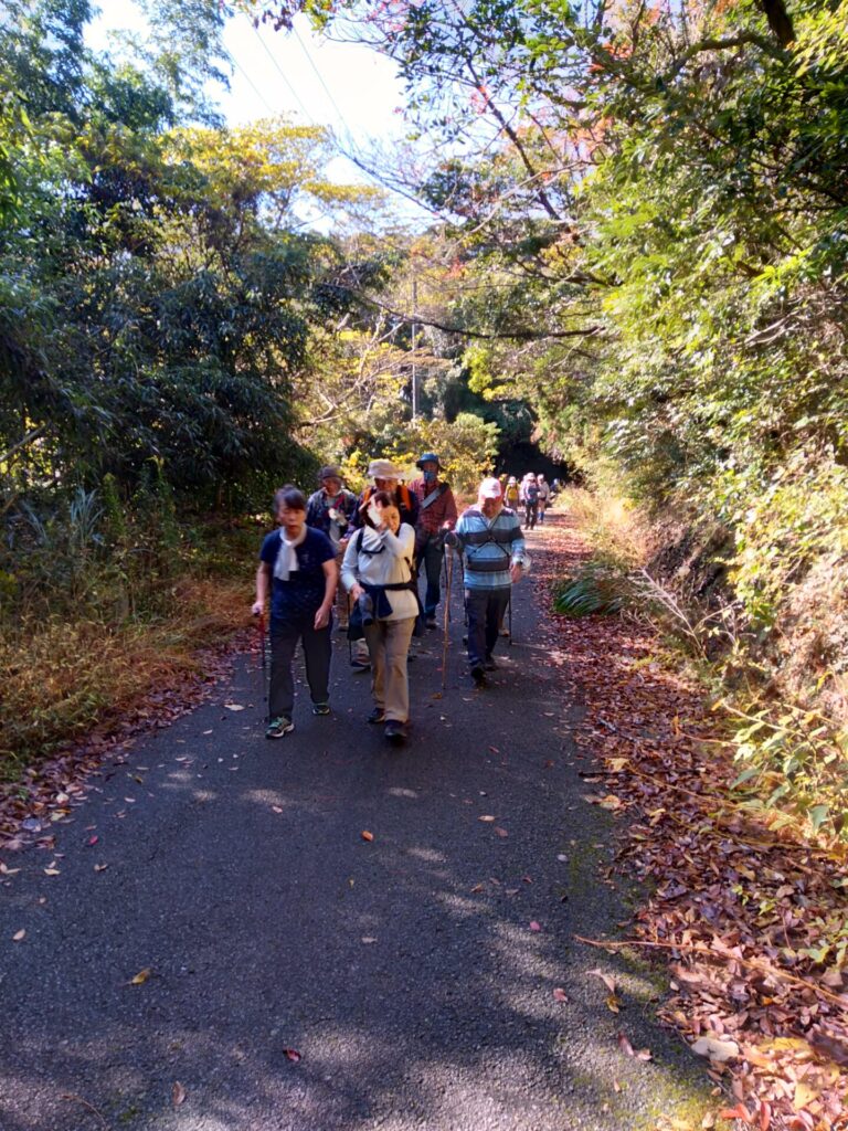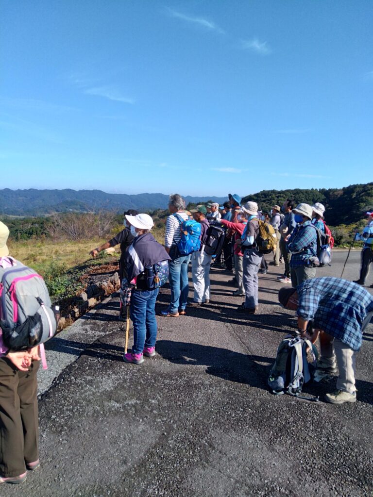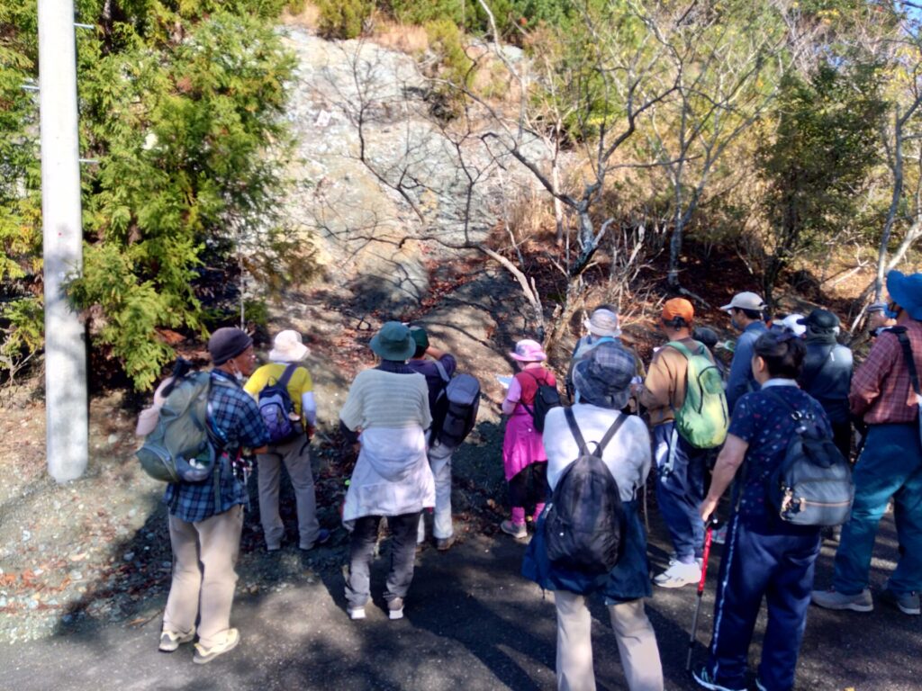 11月22日(火)、山田地区にある頼朝伝説の楊枝井戸や蛇紋岩が露出している場所を巡りました。集合場所の高照寺下駐車場を出発し、ゴルフ場へと続く坂道を経て嶺岡林道に出ると、蛇紋岩が露出しているところがあります。蛇紋岩は、その名の通り蛇の胴体の斑紋に似た模様の岩で、平安時代には安房の寺などの石造物や嶺岡牧の土手や石仏などに使用されたそうです。林道を東に進むと、源頼朝が長狭に向かう途中、喉が渇いたので水を飲もうとしましたが周りに水がなく、口にしていた楊枝を地に刺したら、そこから水が湧き出したという伝説の楊枝井戸を見学しました。途中、雲海が見える絶景ポイントに巡りあうなど充実した時間を過ごしました。