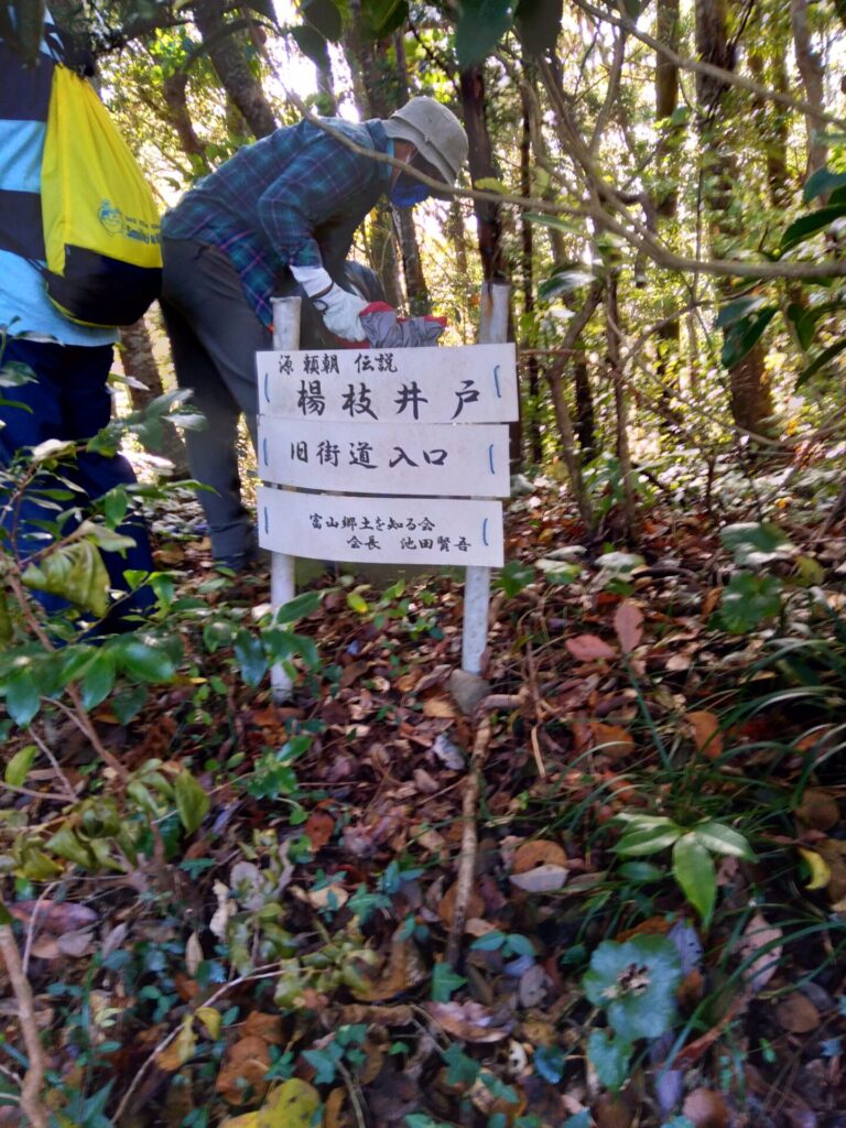 ゴルフクラブから嶺岡林道を東に2km程行ったところに「楊枝井戸」と呼ばれるところがあります。長狭へ向かう頼朝が、喉が渇いたので水を飲もうとしましたが、あたりに水がなく、口にしていた楊枝を地に刺したら、そこから水が湧きだしたという伝説のところです。