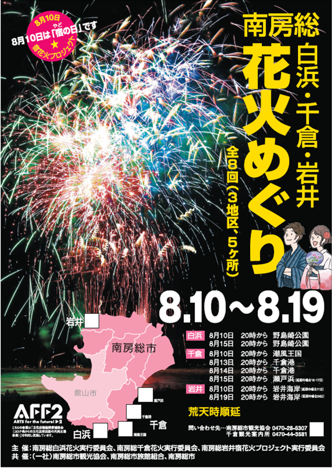 南房総市の岩井、白浜、千倉の3地区で、8月10日から花火を打ち上げるイベント「南房総花火めぐり」が開催さます。