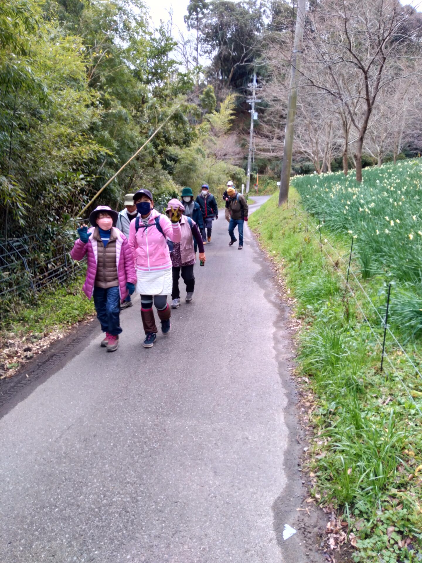 当日は曇り空の中、江月の水仙ロードにある富士山絶景は観れず、水仙ロードはアップダウンの急な坂道でしたが、皆様は綺麗な水仙や梅🌺、早咲き桜🌸を観れて、ワイワイガヤガヤとウオーキングを楽しみながら、最後の新鮮なお野菜のお土産を手に「次も楽しみにしていますよ!」と帰途に着かれました。