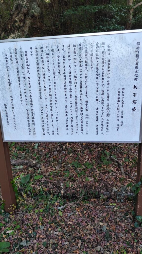 板石塔婆(いたいしとうば)は、中世に造られた緑泥片岩(青石)の供養塔で、板碑とも呼ばれます。信福寺の板石塔婆は高さが148cm、幅が50cmあります。頂部が山形で、その下に二本線を刻み身部には梵字一字で表した阿弥陀仏と観音菩薩・勢至菩薩が刻まれています。このような形の石版塔婆は「武蔵式石版塔婆」と言われるそうです。安房地方には数少ない板石塔婆で、鋸南町指定の有形文化財になっています。