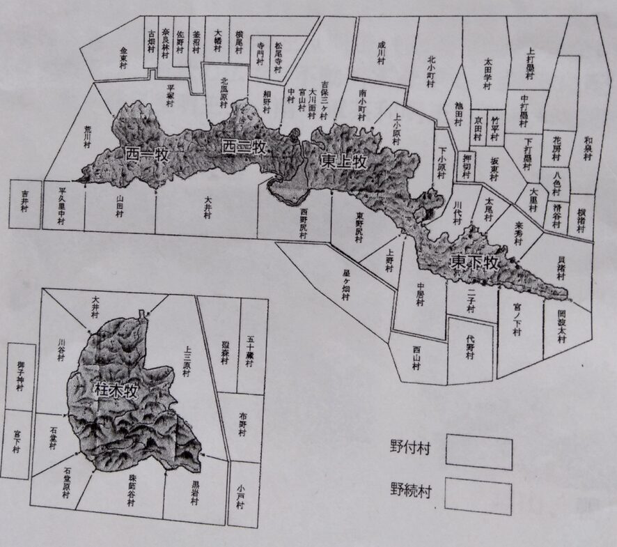 嶺岡牧は嶺岡山系と、それに隣接した柱木山に形成された牧です。当初は、東ノ牧と西ノ牧に区分されていましたが、徐々に整備拡張され、徳川吉宗の時代の享保12年(1721)に「東上牧」、「東下牧」、「西一牧」、「西二牧」、「柱木牧」の5つの牧に分割されました。