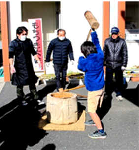 当日は晴天ながらも冷たい風が強く吹く中での餅つきとなりましたが、生徒たちは寒さなんてへっちゃらという感じで初めて持つ杵を振り上げ、交代で餅つきに挑んでいました。