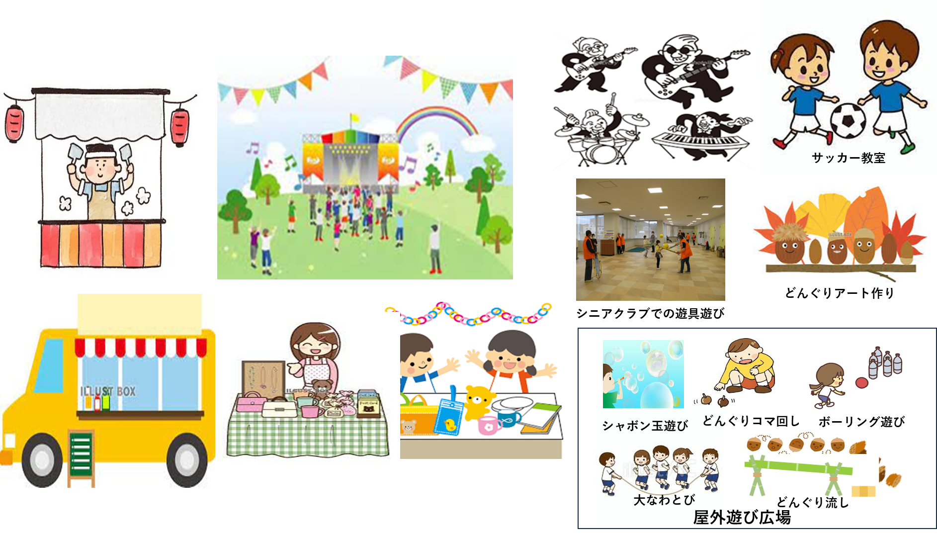 また、アリーナ(体育館)では歌と演奏、ジュニアサッカー教室(男女含め最大30名、要予約)、シニアクラブ様の遊具遊び、どんぐりアート作り等の楽しいイベントが行われます。