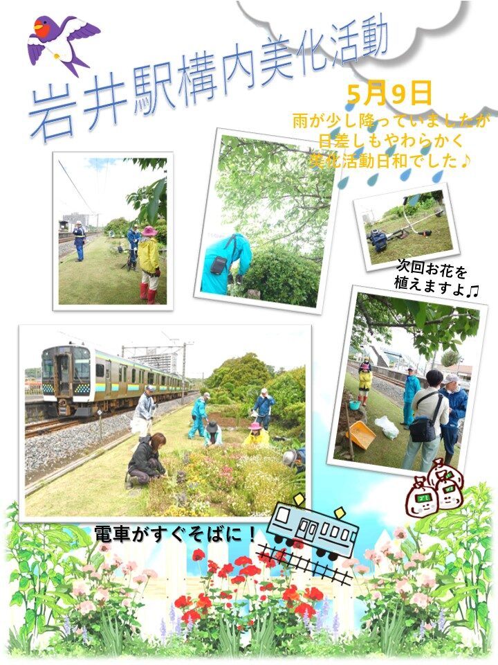 5/9に岩井駅構内の花壇の草灯りと整備(毎月第二木曜日に実施)を「岩井案内人の会」の皆さんと一緒に行いました。当日は房日新聞社での取材もしていただけました。来月はお花の入れ替えを行う予定です。